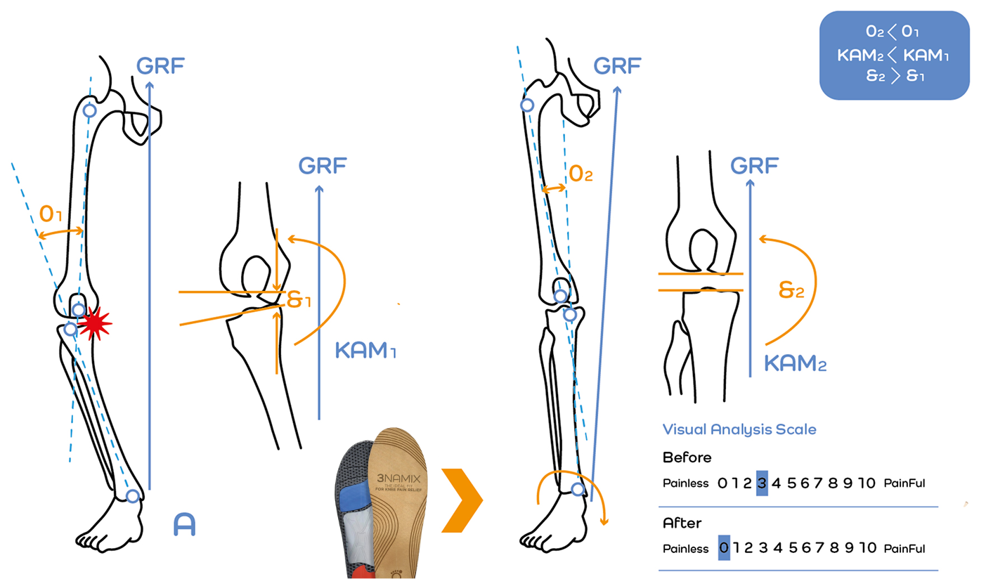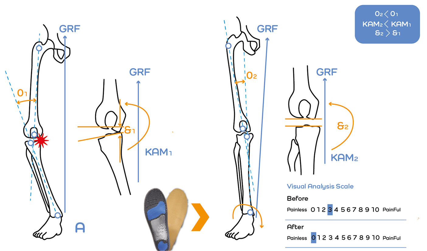 By reducing excessive inward forces on the knee joint, this insole minimizes cartilage wear and alleviates discomfort associated with mild knee osteoarthritis, offering a practical and effective alternative for pain relief.